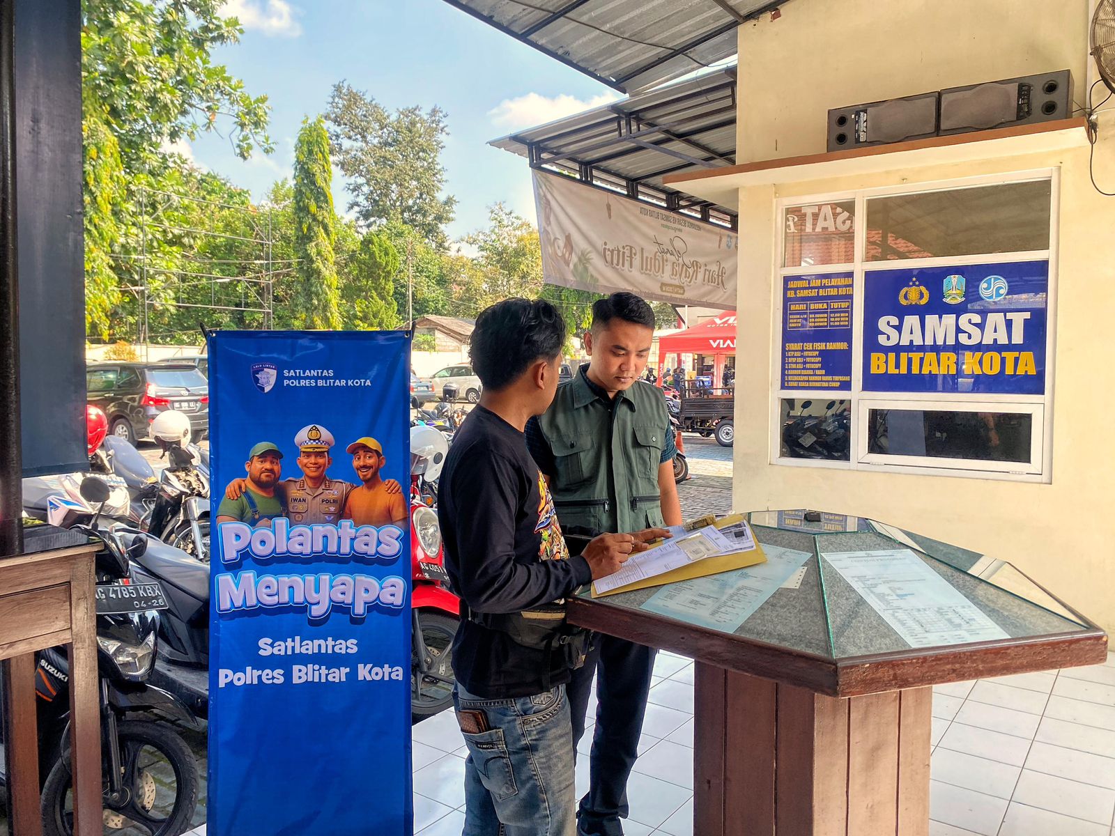 Personil Samsat Polres Blitar Kota langsung turun tangan melayani pengurusan registrasi dan identifikasi kendaraan bermotor di kantor Samsat Blitar Kota, Senin (20/4/2026). Mereka tidak hanya duduk di balik meja, tetapi juga aktif menyapa dan mendampingi masyarakat yang mengurus surat kendaraan.